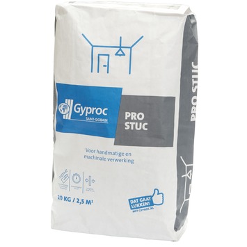 Gyproc Pro Stuc is een professioneel stukadoorsgips met een lange verwerkingstijd (3,5 uur) en een iets grovere korrelopbouw dan bijvoorbeeld Gyproc Multi Stuc. Grote voordeel van de iets grovere korrel is de lichte verwerking bij het reien van de gips.