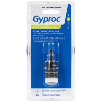 Om ervoor te zorgen dat alle schroeven op de juiste diepte in je gipsplaten komen, gebruik je Gyproc Schroefkoppeling. Deze adapter sluit je eenvoudig aan op een zeskantboorkop, zodat je de gaten snel in de gipsplaten kunt boren. Je stelt de schroefdiepte heel simpel zelf in en dankzij het speciale ontkoppelingsmechanisme laat de koppeling direct los bij de gewenste schroefdiepte. Op deze manier zorg je ervoor dat de gipsplaat niet beschadigt. Kortom: een onmisbaar accessoire voor in iedere kluskoffer.
