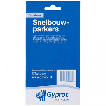Fixeer staalprofielen onderling met behulp van Gyproc Snelbouwparkers. Deze snelbouwparkers, die in een verpakking van 50 stuks worden geleverd, betreffen zelftappende parkers voor het onderling bevestigen van metalen Gyproc Staanders en Gyproc Liggers. Ze zijn geschikt voor toepassing in speciale situaties, zoals de raveling van kozijnen en vensters. Zo kan je er bijvoorbeeld een dwarsligger mee op het kozijn bevestigen. Schroef deze vast met snelbouwparkers aan de staanders en met gipsplaatschroeven aan het kozijn. Doordat de metaalschroeven zijn voorzien van een vlijmscherpe spoed die doorloopt tot aan de kop, baant de parker zich makkelijk een weg in het materiaal. Niet voor niets monteert u Gyproc Snelbouwparkers in een handomdraai.
