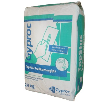 Gyproc TopStuc Badkamergips is geschikt om natte ruimtes te stukadoren. Het gips heeft een hoge vochtbestendigheid, is soepel en droogt snel. Daardoor is het makkelijk aan te brengen en snel af te werken. Zo kunnen ook doe-het-zelvers die weinig ervaring hebben met stukadoren, goed met het gips overweg. Zij brengen met het Badkamergips snel een strakke, gladde stuclaag aan in badkamer, toilet of doucheruimte. Het gips is daarnaast geschikt als basis onder tegelwerk. Het Badkamergips van Gyproc herkent u aan de groene kleur en heeft een inhoud van 20kg.