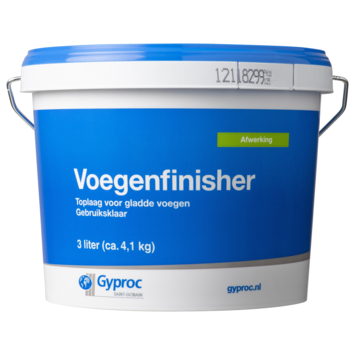 Je werkt voegen van Gyproc Wandplaten, Gyproc Badkamerplaten en HABITO® strak en egaal af met Gyproc Voegenfinisher wit 3l. Gyproc Voegenfinisher is de toplaag voor het glad afwerken van de voeg. De voegenfinisher is gebruiksklaar en verpakt in een totaalverpakking van 3 liter. Het materiaal is smeuïg, eenvoudig te verwerken en, dankzij de fijne structuur, dun aan te brengen. Bovendien is voegenfinisher na uitharding gemakkelijk te schuren. Dit alles zorgt ervoor dat de voeg naadloos in het plaatoppervlak overgaat. De voegenfinisher is te gebruiken in combinatie met de voegenvuller. Kortom, Gyproc Voegenfinisher is de finishing touch van al je voegwerk.