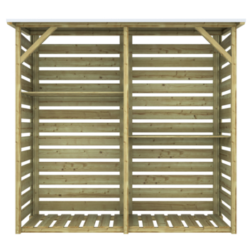 Met de haardhoutberging Twin haal je een stijlvolle en praktische oplossing in huis voor het opslaan van haardhout en andere tuinbenodigdheden. Deze berging is gemaakt van groen geïmpregneerd grenen, wat niet alleen zorgt voor een moderne uitstraling, maar ook de levensduur tot wel 10 jaar verlengt. Het formaat van 176 cm hoogte, 190 cm breedte en 60 cm diepte biedt voldoende ruimte om alles netjes op te bergen.