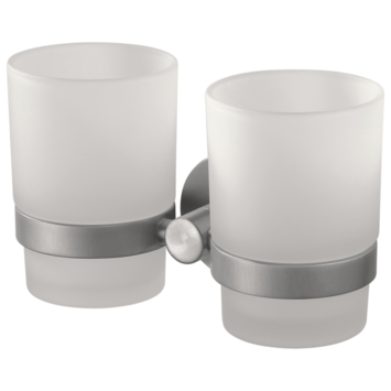 Met deze dubbele bekerhouder heb je altijd voldoende ruimte voor al jouw badkamerbenodigdheden. Ideaal voor bij een dubbele wasbak of om het ene glas te gebruiken voor drinken en het andere voor je tandenborstels. De matglazen bekers worden stevig op hun plek gehouden door de stijlvolle RVS-look houder. Met een lengte van 16 cm, een hoogte van 9 cm en een muurafstand van 7,5 cm is hij compact en neemt hij nauwelijks ruimte in. De montage is eenvoudig met een rond muurplaatje en de meegeleverde schroeven. Zo breng je zowel stijl als gemak in jouw badkamer.