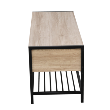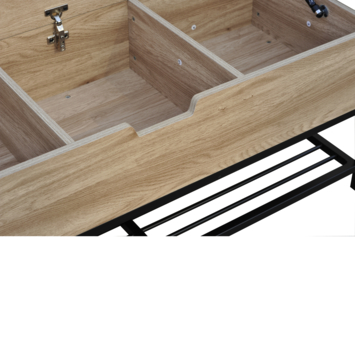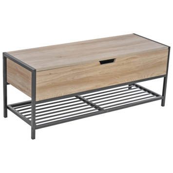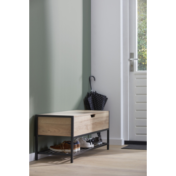 De halbank Angela is een mooie praktische bank voor in de hal. Deze halbank heeft een plank voor bijvoorbeeld het opbergen van schoenen, een handige afgesloten bergruimte onder de klep voor het opbergen van losse spullen en een zitgedeelte met een maximaal draaggewicht van 150 kg. De halbank is gemaakt van MDF en metaal.