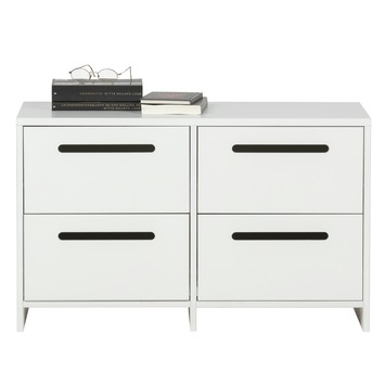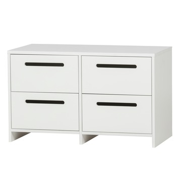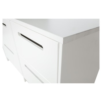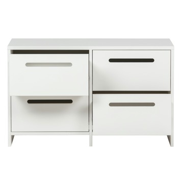 Schoenenkast Bron heeft 4 laden voorzien van een ladegeleider (kogelgeleider 310x17), met elk een open handgreep, waardoor de schoenen in de kast fris geventileerd worden opgeborgen. De laden hebben ieder een binnen breedte van 34,5 cm, een binnen hoogte van 34,5 cm en een binnen diepte van 33,5 cm. Deze kast weegt 16,9 kg.