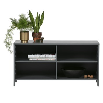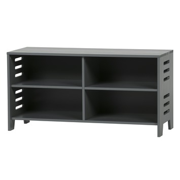 In deze vakkenkast kun je manden gebruiken als praktische opbergers om losse rommeltjes op te bergen. Maar ook zonder manden kun je veel kwijt in deze royale kast. Een paar lossen kussentjes bovenop nodigen meteen uit om plaats te nemen.