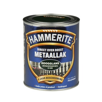 Hammerite metaallak donkergroen hoogglans 250 ml is een decoratieve, roestwerende metaallak voor alle soorten metaal. U kunt het zonder grondverf direct over roest aanbrengen. U hoeft dus niet urenlang te schuren of te ontroesten want Hammerite metaallak hecht uitstekend. Het stopt het roestproces en geeft maar liefst 8 jaar roestbescherming. Hammerite metaallak hoogglans is waterafstotend en weersbestendig waardoor u het goed kunt gebruiken voor de bescherming van allerlei metalen objecten buiten. Hammerite metaallak is in diverse kleuren leverbaar en is UV-bestendig waardoor het metaal langdurig mooi blijft. De inhoudsmaat is 750 ml.