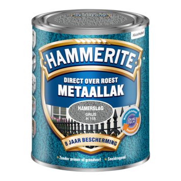 Hammerite metaallak grijs hamerslag 750 ml is een decoratieve, roestwerende metaallak die u zonder primer of grondverf direct over roest kunt aanbrengen. U hoeft dus niet te schuren of ontroesten want Hammerite hamerslag hecht uitstekend. Het stopt het roestproces en geeft maar liefst 8 jaar roestbescherming. Hammerite hamerslag is weerbestendig en kan dus goed gebruikt worden om uw tuin- of balkonhek op te knappen. Hammerite hamerslag is in diverse kleuren leverbaar en met dit bijzondere hamerslageffect maskeert u eenvoudig oneffenheden. De inhoudsmaat is 750 ml.