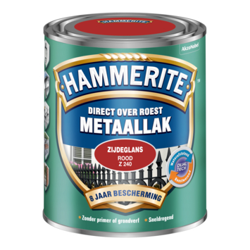 Hammerite metaallak rood zijdeglans 750 ml is een decoratieve, roestwerende metaallak voor alle soorten metaal. U kunt het zonder grondverf direct over roest aanbrengen. U hoeft dus niet urenlang te schuren of te ontroesten want Hammerite metaallak hecht uitstekend. Het stopt het roestproces en geeft maar liefst 8 jaar roestbescherming. Hammerite metaallak zijdeglans is waterafstotend en weersbestendig waardoor u het goed kunt gebruiken voor de bescherming van allerlei metalen objecten buiten. Hammerite metaallak is in diverse kleuren leverbaar en is UV-bestendig waardoor het metaal langdurig mooi blijft. De inhoudsmaat is 750 ml.