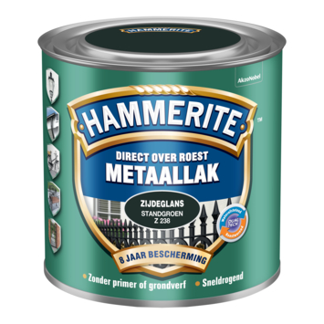 Hammerite metaallak standgroen zijdeglans 250 ml is een decoratieve, roestwerende metaallak voor alle soorten metaal. U kunt het zonder grondverf direct over roest aanbrengen. U hoeft dus niet urenlang te schuren of te ontroesten want Hammerite metaallak hecht uitstekend. Het stopt het roestproces en geeft maar liefst 8 jaar roestbescherming. Hammerite metaallak zijdeglans is waterafstotend en weersbestendig waardoor u het goed kunt gebruiken voor de bescherming van allerlei metalen objecten buiten. Hammerite metaallak is in diverse kleuren leverbaar en is UV-bestendig waardoor het metaal langdurig mooi blijft. De inhoudsmaat is 250 ml.