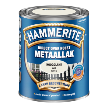 Hammerite metaallak wit hoogglans 750 ml is een decoratieve, roestwerende metaallak voor alle soorten metaal. U kunt het zonder grondverf direct over roest aanbrengen. U hoeft dus niet urenlang te schuren of te ontroesten want Hammerite metaallak hecht uitstekend. Het stopt het roestproces en geeft maar liefst 8 jaar roestbescherming. Hammerite metaallak hoogglans is waterafstotend en weersbestendig waardoor u het goed kunt gebruiken voor de bescherming van allerlei metalen objecten buiten. Hammerite metaallak is in diverse kleuren leverbaar en is UV-bestendig waardoor het metaal langdurig mooi blijft. De inhoudsmaat is 750 ml.