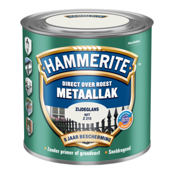 Hammerite metaallak wit zijdeglans 250 ml is een decoratieve, roestwerende metaallak voor alle soorten metaal. U kunt het zonder grondverf direct over roest aanbrengen. U hoeft dus niet urenlang te schuren of te ontroesten want Hammerite metaallak hecht uitstekend. Het stopt het roestproces en geeft maar liefst 8 jaar roestbescherming. Hammerite metaallak zijdeglans is waterafstotend en weersbestendig waardoor u het goed kunt gebruiken voor de bescherming van allerlei metalen objecten buiten. Hammerite metaallak is in diverse kleuren leverbaar en is UV-bestendig waardoor het metaal langdurig mooi blijft. De inhoudsmaat is 250 ml.
