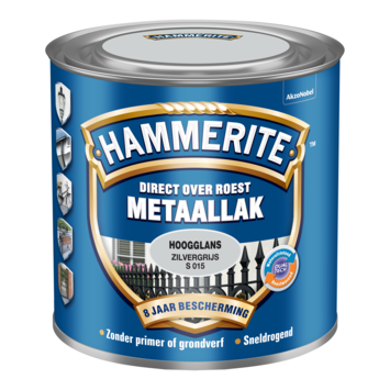 Hammerite metaallak zilvergrijs hoogglans 250 ml is een decoratieve, roestwerende metaallak voor alle soorten metaal. U kunt het zonder grondverf direct over roest aanbrengen. U hoeft dus niet urenlang te schuren of te ontroesten want Hammerite metaallak hecht uitstekend. Het stopt het roestproces en geeft maar liefst 8 jaar roestbescherming. Hammerite metaallak hoogglans is waterafstotend en weersbestendig waardoor u het goed kunt gebruiken voor de bescherming van allerlei metalen objecten buiten. Hammerite metaallak is in diverse kleuren leverbaar en is UV-bestendig waardoor het metaal langdurig mooi blijft. De inhoudsmaat is 250 ml.