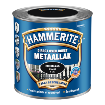 Hammerite metaallak zwart hoogglans 250 ml is een decoratieve, roestwerende metaallak voor alle soorten metaal. U kunt het zonder grondverf direct over roest aanbrengen. U hoeft dus niet urenlang te schuren of te ontroesten want Hammerite metaallak hecht uitstekend. Het stopt het roestproces en geeft maar liefst 8 jaar roestbescherming. Hammerite metaallak hoogglans is waterafstotend en weersbestendig waardoor u het goed kunt gebruiken voor de bescherming van allerlei metalen objecten buiten. Hammerite metaallak is in diverse kleuren leverbaar en is UV-bestendig waardoor het metaal langdurig mooi blijft. De inhoudsmaat is 250 ml.
