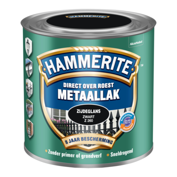 Hammerite metaallak zwart zijdeglans 250 ml is een decoratieve, roestwerende metaallak voor alle soorten metaal. U kunt het zonder grondverf direct over roest aanbrengen. U hoeft dus niet urenlang te schuren of te ontroesten want Hammerite metaallak hecht uitstekend. Het stopt het roestproces en geeft maar liefst 8 jaar roestbescherming. Hammerite metaallak zijdeglans is waterafstotend en weersbestendig waardoor u het goed kunt gebruiken voor de bescherming van allerlei metalen objecten buiten. Hammerite metaallak is in diverse kleuren leverbaar en is UV-bestendig waardoor het metaal langdurig mooi blijft. De inhoudsmaat is 250 ml.