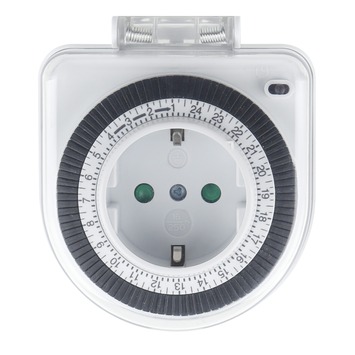 Handson Analoge Tijdschakelklok Spatwaterdicht IP44. Deze schakelklok is spatwaterdicht en mag zowel buitenshuis als ook in vochtige ruimten zoals een garage