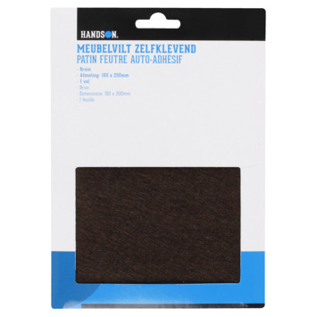 Het HANDSON anti krasvilt wordt gebruikt voor onder het meubilair en beschermt de vloer tegen krassen en andere beschadigingen door het verschuiven van het meubelstuk. Met het HANDSON meubelvilt bruin wordt dat probleem verholpen. Het vilt is reeds voorzien van een zelfklevende laag zodat je het alleen nog maar op maat hoeft te maken. De afmeting van het vel is 150x200 mm en de kleur is bruin.