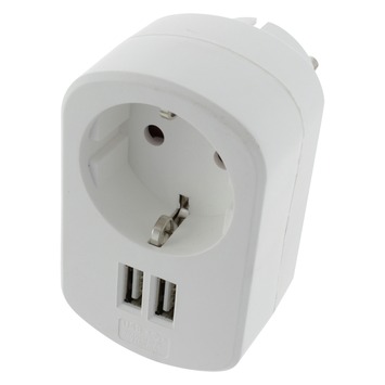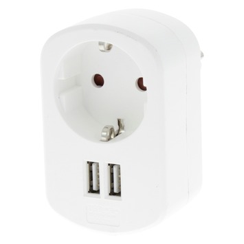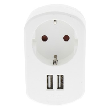 Stekkerdoorvoer 1-voudig met randaarde en twee USB aansluitingen. Alleen voor binnengebruik in droge ruimten. Alleen voor huishoudelijke doeleinden. Stopcontact: 230V - 50 Hz, max. 3500 Watt. USB lader: 5V DC, max. 2100 mA.