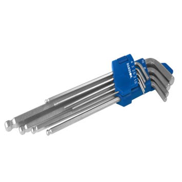 Deze Handson-inbussleutelset met clip bestaat uit 9 zeskantige kogelkopsleutels van 1,5mm tot 10mm. De extra lange inbussleutels met kogelkop hebben de volgende sleutelmaten: 1,5mm, 2mm, 2,5mm, 3mm, 4mm, 5mm, 6mm, 8mm en 10mm. De kogelsleutels die geschikt zijn voor kogelkopschroeven zijn gemaakt van hoogwaardig chroom-molybdeen-vanadiumstaal. Dankzij de kogelkop is het mogelijk om onder een hoek te werken. Dit maakt de set kogelsleutels ideaal voor schroeven op moeilijk bereikbare plaatsen. De set lange inbussleutels met zeskantige kogelkoppen van 1,5mm tot 10mm bergt u handig en overzichtelijk op in de bijgevoegde clip. Hierdoor kunt u de set stiftsleutels met kogelkop makkelijk meenemen en heeft u alle 9 maten inbussleutels van 1,5mm tot 10mm direct beschikbaar. Met de set extra lange kogelkopsleutels draait u zeskantige kogelkopschroeven met afmetingen van 1,5mm tot 10mm los of vast.
