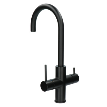 Met de Handson kokenwaterkraan Ace met hendel Zwart hoef je nooit meer te wachten tot je water kookt! Kokend water is direct beschikbaar uit de 3-in-1 kokendwaterkraan. Uit één en dezelfde kraan haal je naar keuze 100°C kokend water, kraanwarm water of koud water. Met de rechter hendel draai je eenvoudig met 1 hand de kraan naar de gewenste temperatuur tussen koud en kraanwarm. De linker hendel is voor direct kokend water. Een kop thee zetten is in een handomdraai gebeurd! En aan de kinderveiligheid is ook gedacht: de kokendwaterhendel is alleen om te draaien als je de linkerknop ingedrukt houdt. De hendels draaien soepel en nauwkeurig door de keramische schijven, die bovendien weinig onderhoud nodig hebben. De meegeleverde roestvrijstalen boiler heeft een inhoud van 4 liter. Handig als je veel kokend water nodig hebt, bijvoorbeeld bij het koken. Wil je een grote pan vullen? De hoge uitloop op 29 cm maakt dat mogelijk. De uitloop kun je ook 360° draaien, zo maak je eenvoudig plaats in je gootsteen. Met deze kraan haal je niet alleen veel gemak en comfort in huis, ook is het met zijn elegant ontwerp en mat zwarte afwerking een verrijking in elke industriële of landelijke keuken. De kokendwaterkraanset wordt geleverd met een kokendwaterkraan, 3 flexibele aansluitslangen, RVS waterboiler van 4 liter, aanluitmateriaal en montagesleutel. Met de montagehandleiding is de set makkelijk te installeren. Let er altijd op dat je de boiler eerst laat vollopen met water, voordat je deze aanzet. Gebruik alleen water en een zachte doek om de kraan schoon te maken. Gebruik geen schurend, bijtend, azijnhoudend of agressief schoonmaakmiddel. Besluit je deze kokendwaterkraan te kopen? Dan kun je ook profiteren van 2 jaar fabrieksgarantie.