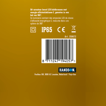 De Handson LED-buis is een energiezuinig alternatief voor TL-lampen. De LED-lichtbron met beweginssensor, die 17 watt verbruikt, produceert wit licht (4000K) met een lichtopbrengst van 1800 lumen. De lamp heeft een lengte van 61,2 centimeter. Het heeft een lange levensduur van maximaal 25.000 branduren. De Handson LED-buis beschikt over een IP65 beschermingsklasse en is dus waterdicht.