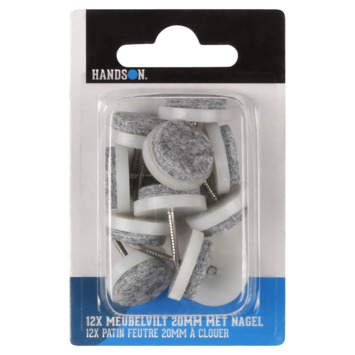 De HANDSON meubelglijders met nagel kun je gebruiken onder de (stoel)poten of meubelstukken wanneer je een harde vloer hebt zoals hout, laminaat, keramiek Het contactoppervlak van de meubelglijder is gemaakt van anti kras vilt en je bevestigt de meubelglijder gemakkelijk door de nagel in de (stoel)poot te slaan. De maat is Ø20 mm en in de verpakking zitten 12 stuks in de kleur grijs.