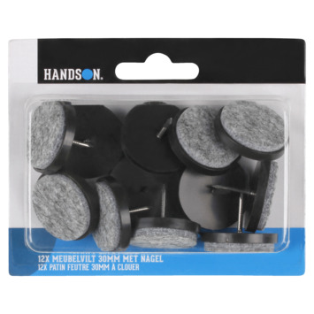 De HANDSON meubelglijders met nagel kun je gebruiken onder de (stoel)poten of meubelstukken wanneer je een harde vloer hebt zoals hout, laminaat, keramiek Het contactoppervlak van de meubelglijder is gemaakt van anti kras vilt en je bevestigt de meubelglijder gemakkelijk door de nagel in de (stoel)poot te slaan. De maat is Ø30 mm en in de verpakking zitten 12 stuks in de kleur bruin.