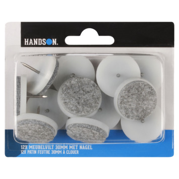 De HANDSON meubelglijders met nagel kun je gebruiken onder de (stoel)poten of meubelstukken wanneer je een harde vloer hebt zoals hout, laminaat, keramiek Het contactoppervlak van de meubelglijder is gemaakt van anti kras vilt en je bevestigt de meubelglijder gemakkelijk door de nagel in de (stoel)poot te slaan. De maat is Ø30 mm en in de verpakking zitten 12 stuks in de kleur grijs.