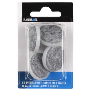 De HANDSON meubelglijders met nagel kun je gebruiken onder de (stoel)poten of meubelstukken wanneer je een harde vloer hebt zoals hout, laminaat, keramiek Het contactoppervlak van de meubelglijder is gemaakt van anti kras vilt en je bevestigt de meubelglijder gemakkelijk door de nagel in de (stoel)poot te slaan. De maat is Ø30 mm en in de verpakking zitten 4 stuks zodat je voldoende hebt voor 1 stoel.
