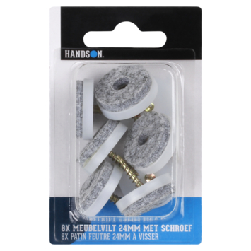 De HANDSON meubelglijders met schroef kun je gebruiken onder de (stoel)poten of meubelstukken wanneer je een harde vloer hebt zoals hout, laminaat, keramiek Het contactoppervlak van de meubelglijder is gemaakt van anti kras vilt en je bevestigt de meubelglijder gemakkelijk door de schroef in de (stoel)poot te schroeven. De maat is Ø24 m en in de verpakking zitten 8 stuks in de kleur grijs.