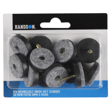 De HANDSON meubelglijders met schroef kun je gebruiken onder de (stoel)poten of meubelstukken wanneer je een harde vloer hebt zoals hout, laminaat, keramiek Het contactoppervlak van de meubelglijder is gemaakt van anti kras vilt en je bevestigt de meubelglijder gemakkelijk door de schroef in de (stoel)poot te schroeven. De maat is Ø28 mm en in de verpakking zitten 12 stuks in de kleur bruin.