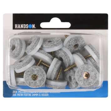 De HANDSON meubelglijders met schroef kun je gebruiken onder de (stoel)poten of meubelstukken wanneer je een harde vloer hebt zoals hout, laminaat, keramiek Het contactoppervlak van de meubelglijder is gemaakt van anti kras vilt en je bevestigt de meubelglijder gemakkelijk door de schroef in de (stoel)poot te schroeven. De maat is Ø24 mm en in de verpakking zitten 20 stuks in de kleur grijs.