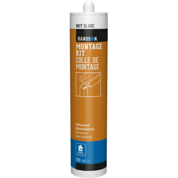 Handson montagekit wit 290ml is een krachtige universele montagekit met hoge aanvangshechting (> 50 kg/m2). Zeer goede hechting aan alle gebruikelijke poreuze bouwondergronden. Geschikt voor muurvaste bevestiging van plinten, kunststof ornamenten en andere decoratiematerialen. De lijmverbinding kan na 48 uur belast worden.