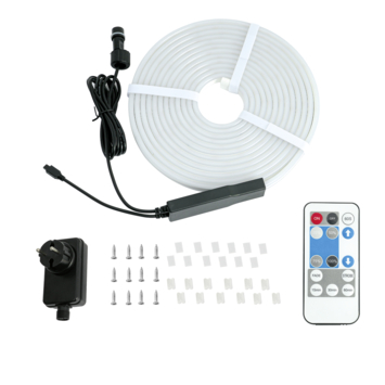 Ben je op zoek naar een unieke manier om je ruimte te verlichten? Deze Neon LED-strip biedt uitkomst!  In tegenstelling tot standaard led strips, waarbij de individuele led-punten vaak zichtbaar zijn, geeft een neon LED-strip een egale en doorlopende lichtlijn. Dit zorgt voor een stijlvolle en strakke uitstraling, ideaal voor decoratieve en functionele toepassingen. Deze LED-strip kan op helder maar ook op warmwit (3000K) licht gezet worden. Hiermee dus eenvoudig aan te passen aan je stemming of gelegenheid. De LED strip is 5 meter lang en met de meegeleverde afstandsbediening te dimmen naar elk gewenste stand. Met een IP65-waarde is deze LED-strip geschikt voor buiten. De adapter heeft een IP44-waarde. Eenvoudige installatie, want de LED strip is voorzien van een plakstrip over de gehele lengte. De LED strip is niet in te korten!