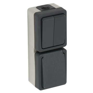 Deze combinatieschakelaar (wisselschakelaar en wandcontactdoos in één) met randaarde grijs/zwart is spatwaterdicht (beschermingsklasse IP44), dus geschikt voor montage in vochtige ruimtes of buitenshuis. Maximaal aansluitvermogen 2300 watt. Met een serieschakelaar kun je twee verschillende lichtpunten vanaf één plaats in- en uitschakelen, zoals berging- en buitenlamp.