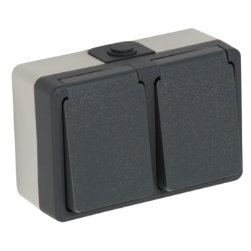 Deze dubbele wandcontactdoos met randaarde is spatwaterdicht (beschermingsklasse IP54), dus geschikt voor (horizontale) montage in vochtige ruimtes of buitenshuis. Maximaal aansluitvermogen 3680 watt.