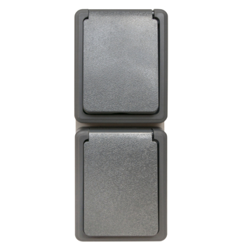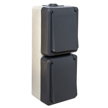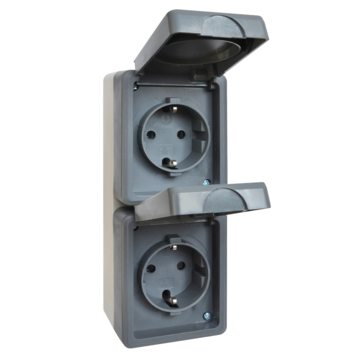 Deze dubbele Handson wandcontactdoos/buitenstopcontact met randaarde is spatwaterdicht (beschermingsklasse IP54), dus geschikt voor (verticale) montage in vochtige ruimtes of buitenshuis. Maximaal aansluitvermogen 3680 watt.