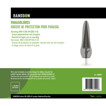 Om je parasol te beschermen tegen verschillende weerselementen kan je gebruik maken van een parasolhoes. De Parasolhoes 250x64 cm is namelijk gemaakt van sterk, waterafstotend polyester. Om schimmelvorming te voorkomen is het belangrijk dat de parasol kan ademen. Zorg er daarom voor dat de hoes aan de onderkant openblijft. De hoes is 250 centimeter lang en 64 centimeter breed. Kortom, kies deze parasolhoes voor optimale bescherming van je parasol.