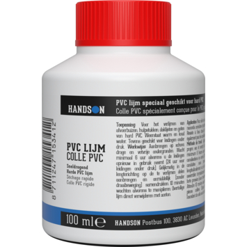 Handson PVC lijm 100 ml is een sneldrogende en harde PVC lijm. Geschikt voor het verlijmen van afvoerbuizen, hulpstukken, daklijsten en goten van hard PVC. Het weerstaat warm en koud water en is tevens geschikt voor leidingen onder druk.