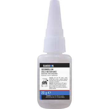 Handson secondelijm 20 ml is een vloeibare, snel uithardende lijm die verhardt door contact met vocht. Deze lijm is ontwikkeld voor het verlijmen van o.a. rubberen ringen, glas, metalen en plastics bij o.a. modelbouw, juwelen en ornamenten.