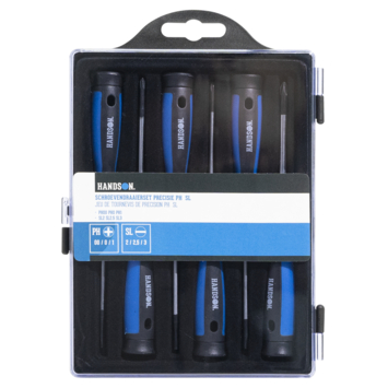 De 6-delige Handson-precisieschroevendraaierset PH-SL bestaat uit 6 schroevendraaiers, gemaakt van chroom-molybdeenstaal. De 6 schroevendraaiers zijn geschikt voor Phillips-kruiskopschroeven met maten PH00, PH0 en PH1 en voor sleufkopschroeven met maten SL2, SL2,5 en SL3. Dit zijn schroeven met afmetingen van 3mm en kleiner. De 6-delige set met schroevendraaiers is dankzij de afmetingen van de PH- en SL-schroevendraaiers ideaal voor precisiewerk, zoals het schroeven van schroeven met kleine maten. Bovendien zijn de precisieschroevendraaiers voorzien van een draaiende kop die het schroeven makkelijker maakt. Bekijk Handson?s assortiment wanneer u op zoek bent naar andere schroevendraaiersets voor precisiewerk.