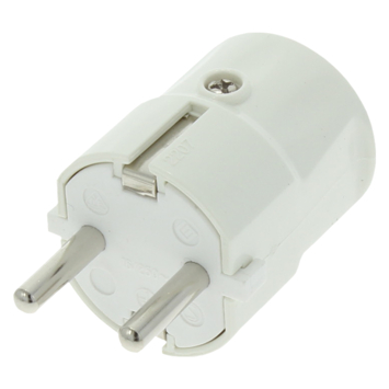 Op deze Handson stekker RA zij-invoer wit met uitloop kun je huishoudelijke apparaten aansluiten. De aarde zorgt ervoor dat, in geval van kapotte- of losgeschoten bedrading in een apparaat (bijvoorbeeld wasmachine of computer), de metalen delen niet onder stroom komen te staan. De stroom wordt dan via een extra aardedraad in de aarde geleid.