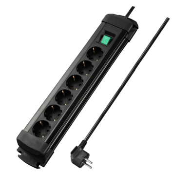 Met de Handson stekkerdoos 6-voudig met schakelaar zwart 3 m sluit je tot zes apparaten tegelijk aan zonder dat het een wirwar van kabels wordt. De aansluitingen staan onder een hoek van 45 graden waardoor brede stekkers elkaar niet raken. Dankzij het snoer van drie meter bepaal je zelf waar je de stekkerdoos legt, of dat nu onder je bureau, bij je tv of naast je werktafel is. Zo heb je altijd genoeg stroompunten binnen handbereik.