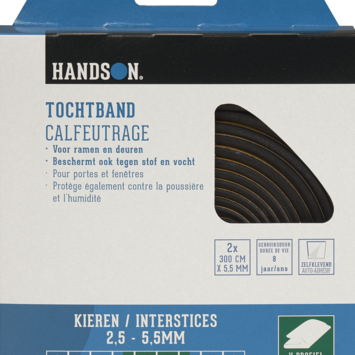 Wil je de kieren en spleten in je ramen of deuren efficiënt dichten? Dicht ze dan af met Handson tochtband V-profiel EPDM-rubber antraciet 3 meter 2 stuks. Dit 3 meter lange, antracietkleurige tochtband met V-profiel is gemaakt van EPDM-rubber, een synthetische rubber gemaakt van Ethyleen, Propyleen en Dieen Methyleen en bekendstaat om zijn lucht- en vochtdichte eigenschappen. Het is bovendien zuur-, zout- en uv-bestendig, het rot niet en heeft een lange levensduur. Deze tochtband met V-profiel is geschikt voor het dichtmaken van kieren vanaf 2,5mm tot en met 5,5mm. Dankzij de zelfklevende lijmlaag monteer je de tochtband makkelijk en snel zelf. Kortom: houd kou, stof en vocht buiten met deze tochtband van Handson.