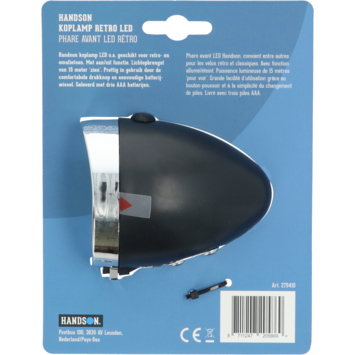 Het retro voorlicht werkt op 3 meegeleverde AAA/LR03 batterijen. Deze voorlamp