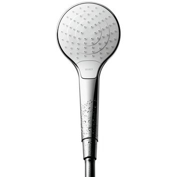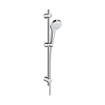 De Hansgrohe Doucheset MySelect S Vario zorgt voor comfortabel doucheplezier. De set bestaat uit een handdouche, een doucheslang van 1,60 m lang en een glijstang met een lengte van 65 cm. De handdouche heeft een diameter van maar liefst 110 mm en met de Select knop kun je snel en gemakkelijk van straalsoort wisselen. Met één druk op de knop kies je uit drie verschillende stralen: de SoftRain, de IntenseRain of de TurboRain straal. Het wit/chromen design geeft een extra frisse uitstraling aan je badkamer. Dankzij de QuickClean anti-kalk functie kan kalk en vuil eenvoudig met de hand of een doek van de siliconen noppen op de douchekop worden weggewreven. Hierdoor blijft de straal langer mooi en gaat hij zeker nog jaren mee.