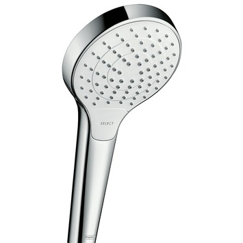 De Hansgrohe handdouche MySelect Vario Ø11 cm 3 Standen met wit/chromen design van Hansgrohe zorgt voor een waar luxe gevoel in je eigen badkamer. De handdouche heeft een diameter van maar liefst 110 mm en met de Select knop kun je snel en gemakkelijk van straalsoort wisselen. Met één druk op de knop kies je uit drie verschillende stralen: de krachtige Rain regenstraal, de IntenseRain of de TurboRain straal. Dankzij de QuickClean anti-kalk functie kan kalk en vuil eenvoudig met de hand of een doek van de siliconen noppen op de douchekop worden weggewreven. Hierdoor blijft de straal langer mooi en gaat hij zeker nog jaren mee.