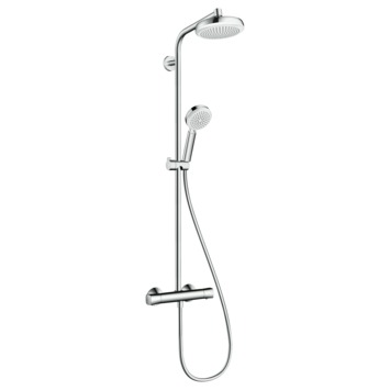 De moderne en luxe regendoucheset zal het stralende middelpunt van je badkamer zijn. Deze Hansgrohe Regendouche Crometta 160 met Thermostatische Douchekraan heeft 1 hoofddouche, 1 handdouche, 1 douchestang met verstelbare handdouchehouder en 1 doucheslang. De thermostatische douchekraan maakt de set compleet. De vaste grote regendouchekop met een diameter van 16 cm geeft een krachtige Rain regenstraal. De hoofddouche en daarmee de straalstand kun je door het kogelgewricht tot een hoek van 45 graden draaien. De Crometta Vario handdouche heeft maar liefst 4 straalsoorten (krachtige regenstraal, normale straal, krachtige shampoostraal, massagestraal). Toch bespaar je op je waterverbruik: je kunt met de EcoStop knop het waterverbruik terugbrengen tot slechts 10 l/min. Goed voor het milieu en je portemonnee. Met de houder stel je de handdouche op de gewenste hoogte in. Het schoonmaken van beide douchekoppen is een fluitje van cent dankzij het QuickClean antikalksysteem waardoor je de kalk eenvoudig weg wrijft. De thermostaat is uitgevoerd met de Safetystop temperatuurbegrenzing welke verbranding boven de 40 graden voorkomt, met de draaiknop stel je de gewenste temperatuur vooraf eenvoudig in. De keramische schijven in het binnenwerk van de kraan zorgt voor minder kalkaanslag en slijtage ten opzichte van een binnenwerk met rubber afdichtingen. Op de regendoucheset en kraan heb je 5 jaar garantie.