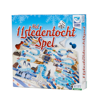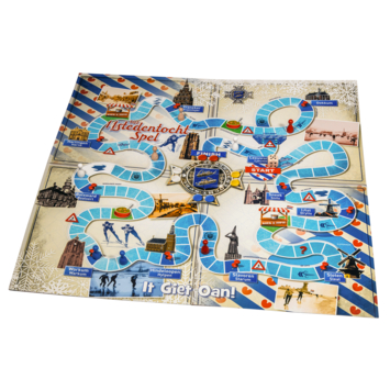 Hét 11-Stedentochtspel. Wie is als eerste bij de finish en wint het felbegeerde elfstedenkruisje? Gooi met de dobbelsteen en verplaats de pion met het aantal ogen dat is gegooid. Wanneer je op één van de vakjes komt met een plaatje, voer dan de opdracht uit die bij het plaatje hoort. Als je bijvoorbeeld moet klúnen, sla je een beurt over. Of heb jij de wind in de rug en telt je worp dubbel? De speler die als eerste over de finish komt, wint de Elfstedentocht. Inhoud: 1 spelbord van 50 x 50 cm, 8 houten pionnen in vier kleuren, 1 dobbelsteen en handleiding met spelregels. Voor 2-4 spelers of teams vanaf 6 jaar.