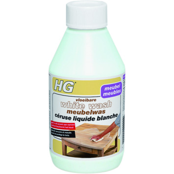 HG vloeibare white wash meubelwas is een kwalitatief hoogwaardige meubelwas. Dit product geeft de nerven en noesten van het hout een mooie witte tekening (het zogenaamde white wash effect) en beschermt het hout bovendien tegen uitdroging, vuil en vlekken. Verwijder oude waslagen eerst volledig met HG meubelwas remover en laat vervolgens de ondergrond goed drogen. Gelakte of geverfde meubels moeten eerst ontdaan worden van de lak- of verflaag, met behulp van bijvoorbeeld HG verf ’kracht’afbijter en/of goed schuren. Maak het meubel goed stofvrij. Schud daarna HG white wash meubelwas eerst goed voor het te gebruiken en breng het product vervolgens dun en gelijkmatig op. Na ongeveer 15 minuten kunt u de was opwrijven. Indien meer ‘white wash effect’ gewenst is, kunnen meerdere lagen aangebracht worden.